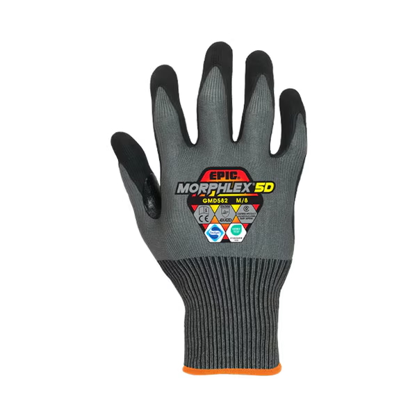 The EPIC® Morphlex® 5D cut resistant nitrile safety glove features the EPICFLOW™ breathable cooling system, premium POLYMERIX™ lightweight high cut resistant liner and TACT™, a premium hybrid nitrile coating.