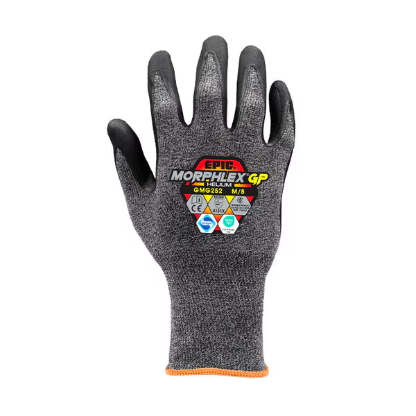 EPIC® Morphlex® Helium® is a General Purpose (GP) nitrile safety glove featuring the EPICFLOW™ breathable cooling system, premium POLYMERIX™ lightweight liner and TACT™, a premium hybrid nitrile coating.